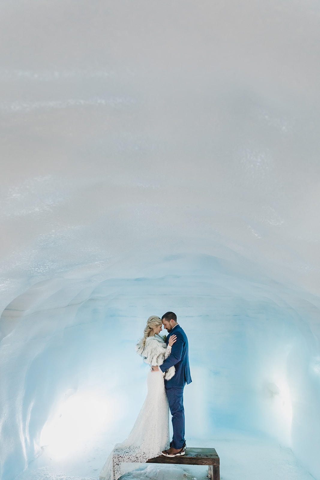 a bride and groom facing each other in an ice cave in iceland for their best elopement destinations