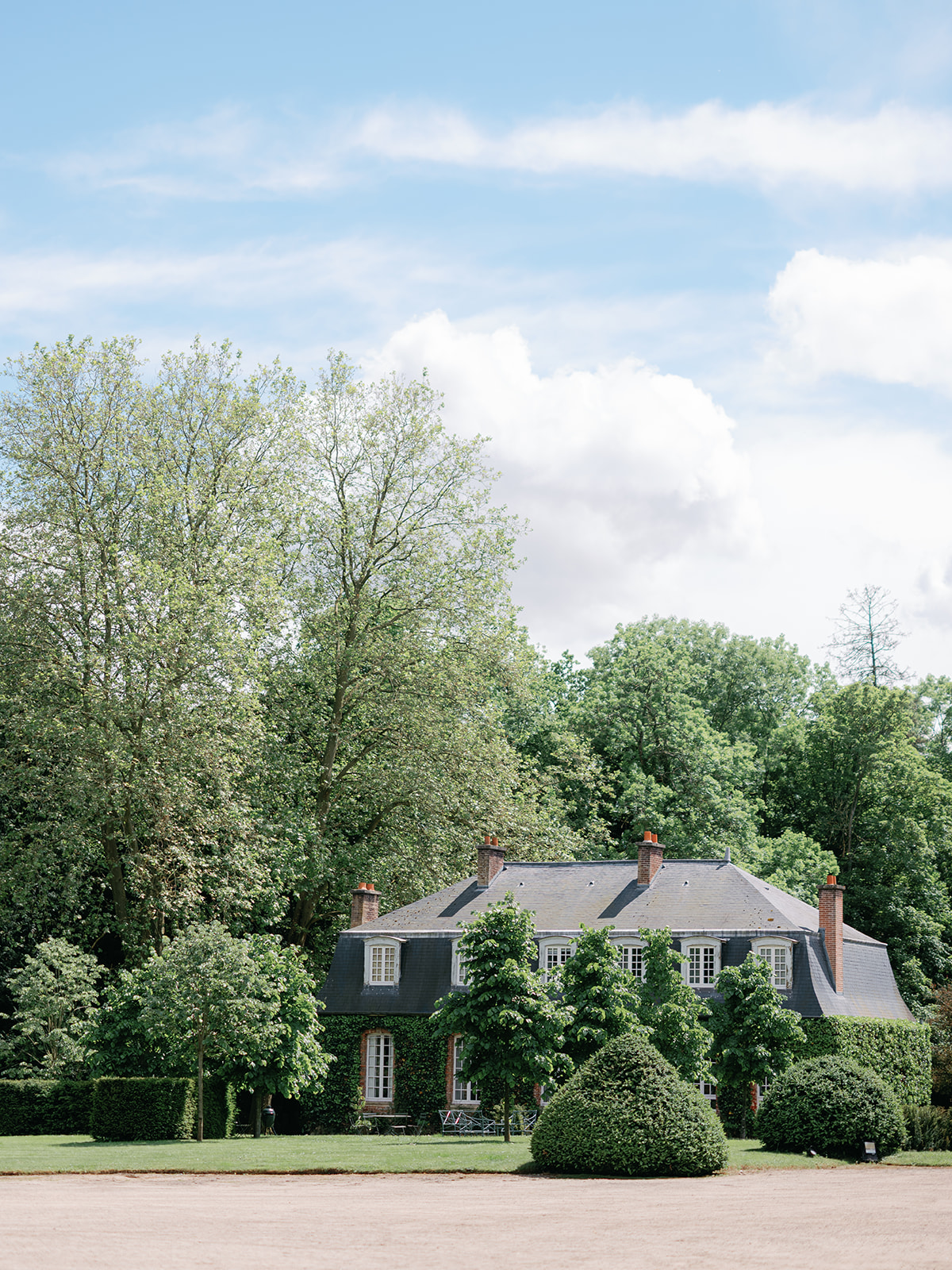 The third distinction is the view. The garden façade of Château de Champlâtreux — the side that faces the parkland and that most guests experience during cocktail hour and outdoor receptions — is one of the most purely beautiful architectural garden prospects I have encountered at any wedding venue anywhere in France. The symmetry of the building, the perron leading down to the lawn, the sweep of the park to the circular stone pond, and the centuries-old tree canopy framing the entire composition: these are the conditions that create images that look immediately and unmistakably like the most beautiful version of France that exists.