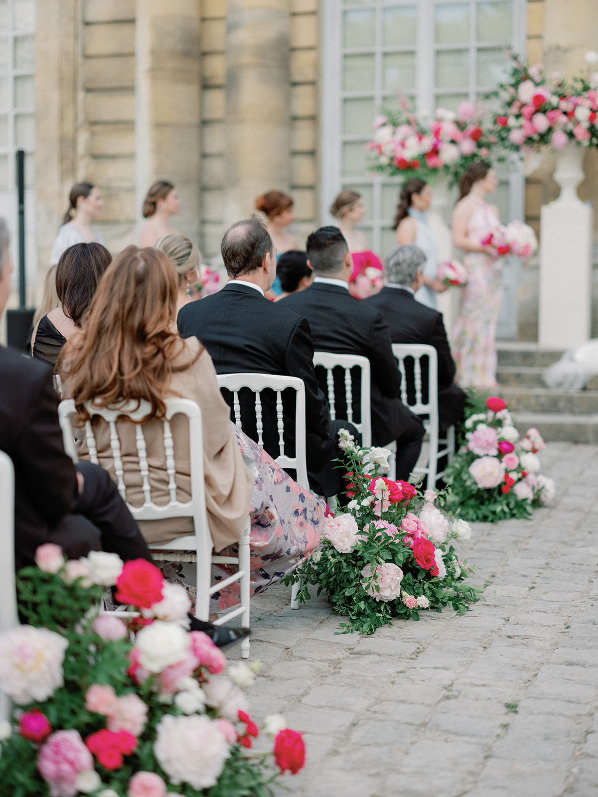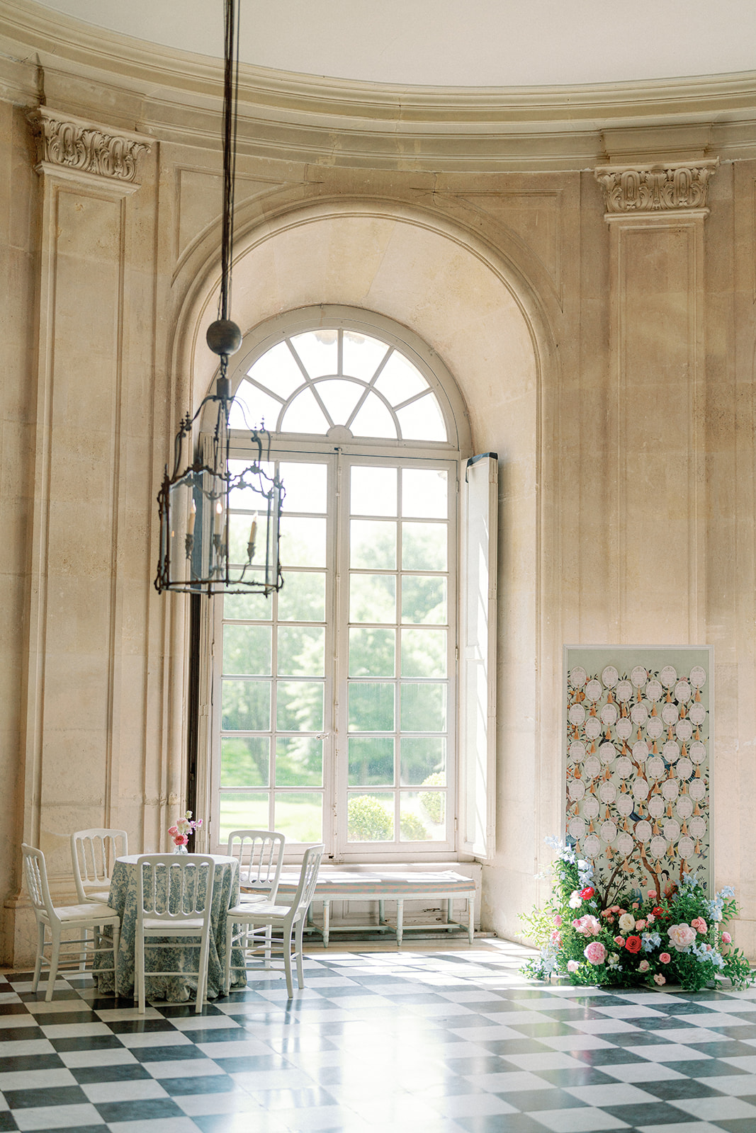I have photographed indoor ceremonies at Champlâtreux when the weather necessitated moving inside, and the resulting images do not feel like a weather contingency. They feel like a deliberate choice that turned out to be the right one. One wedding planner I worked with here made the point that hosting the ceremony indoors actually concentrates the décor — what the vastness of the grounds can dilute, the scale of the Vestibule holds and amplifies.