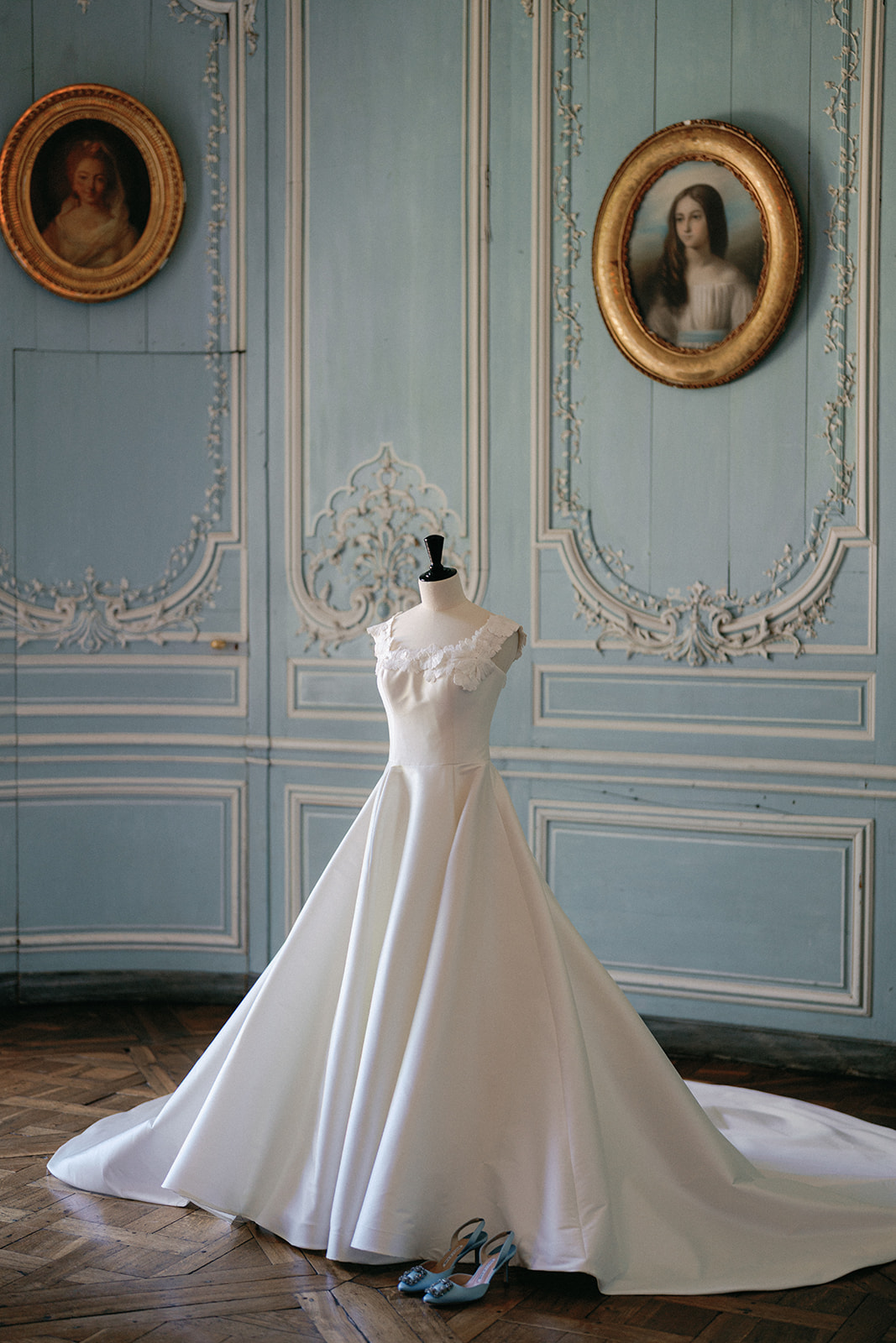 Le Salon Bleu — the Blue Room — has a character distinct from the Grand Salon: the signature Rococo boiseries in blue, the original period woodwork with its carved floral and foliate decoration, and a quality of light that is softer and more intimate than the principal salon. I use Le Salon Bleu consistently for bridal portraits during the getting-ready sequence, particularly in the later morning when the light through its windows is at its most flattering.