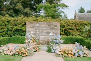 Garden ceremonies at historic estates or castles can sometimes lean overly formal or heavy—but this one feels light, romantic, and modern. The ceremony design allows the setting to speak for itself while being softened by florals that feel organic and painterly rather than structured or stiff.