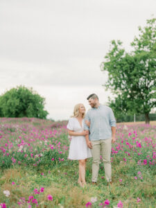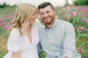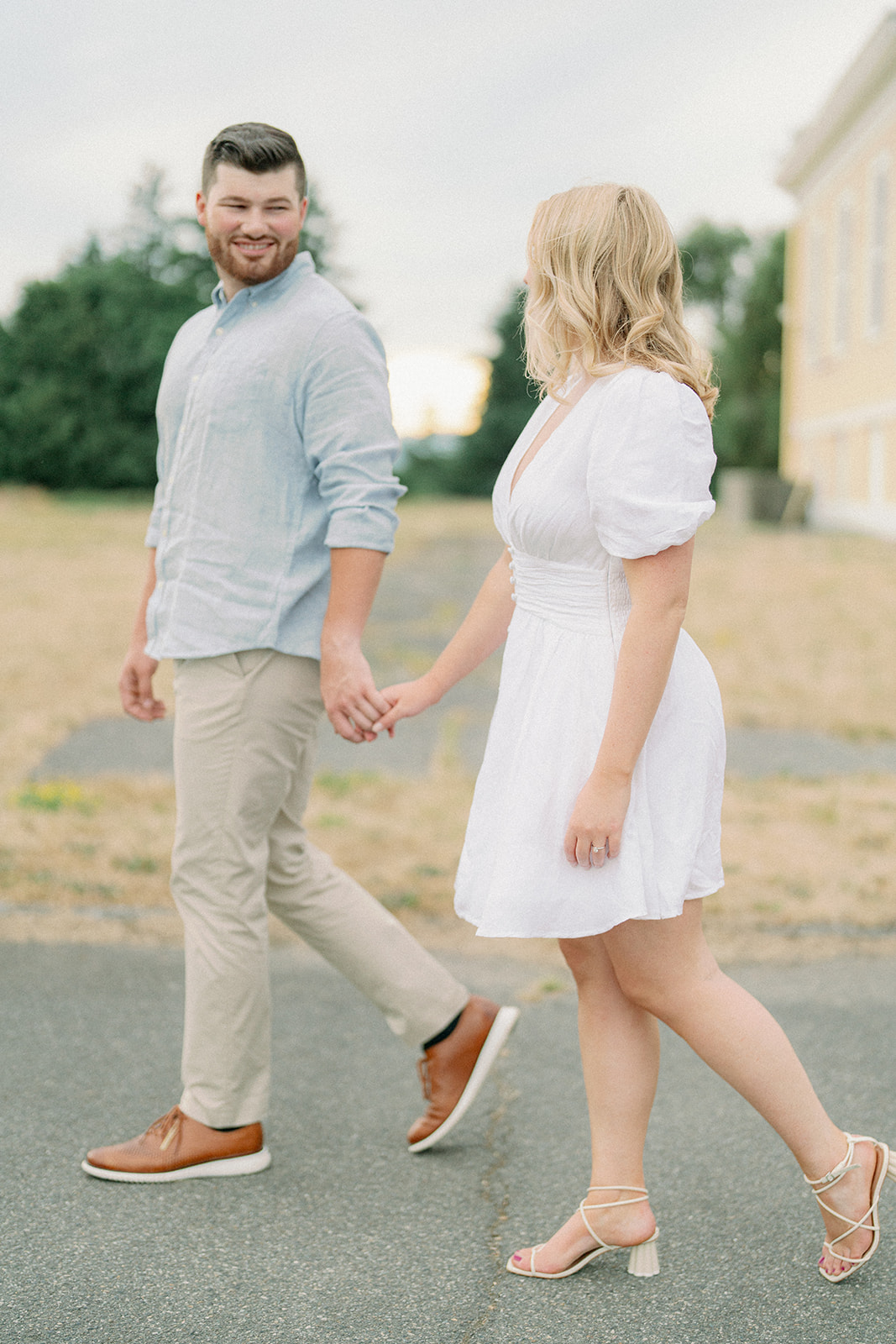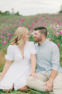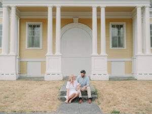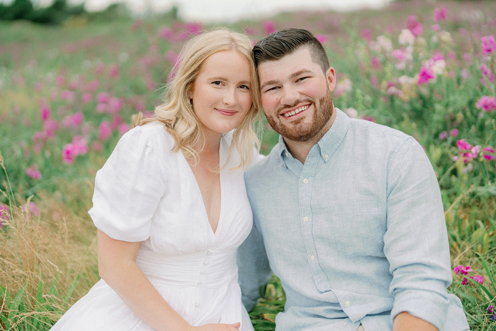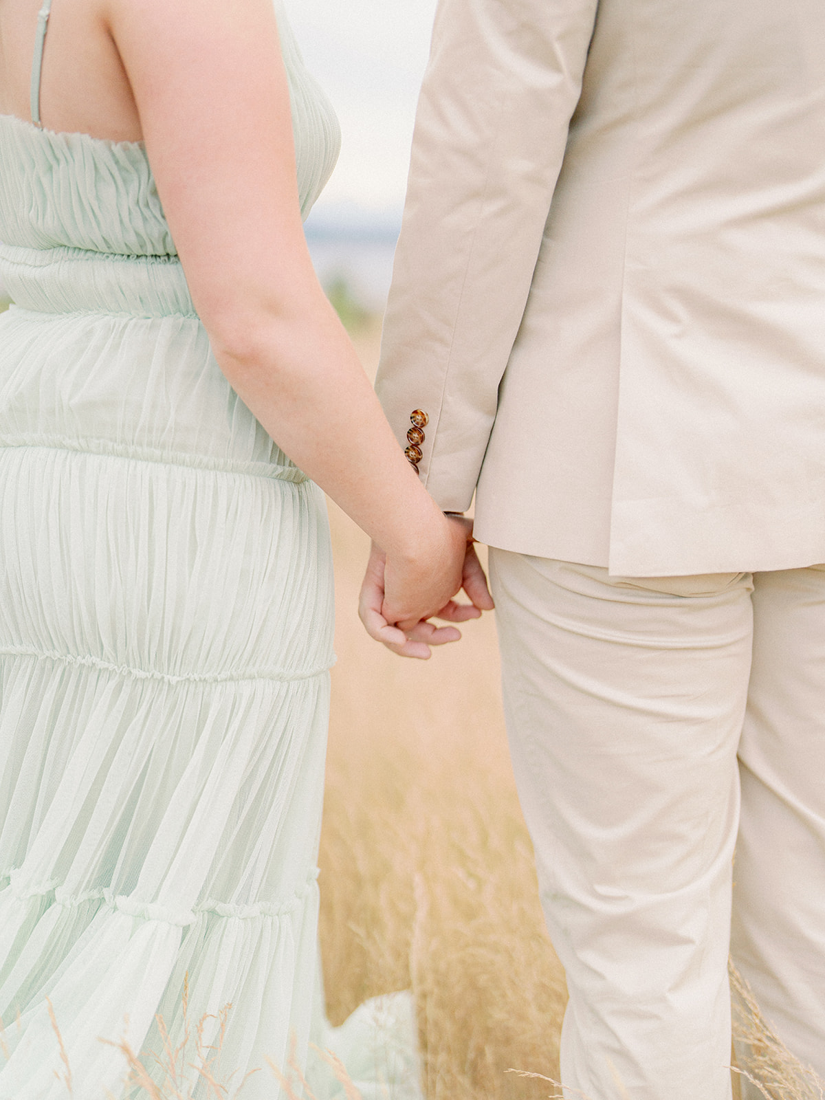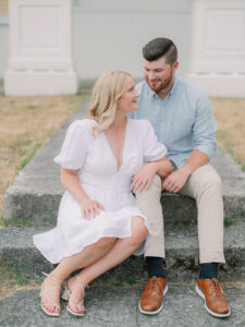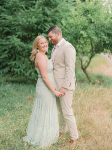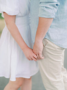The couple chose a palette of soft, neutral colors for their engagement photos, and it could not have worked better for the setting. The tones blended beautifully with the coastal landscape, grassy fields, and muted summer greens, creating images that feel timeless rather than trendy.