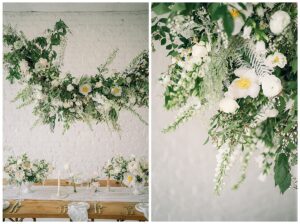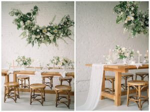 One of the biggest scene-stealers was the floral design—specifically the overflowing hanging floral installation by Villanelle Floral Company. It completely romanticized the space and made the whole studio feel like it was blooming from the ceiling down. The florals were dramatic, but still understated in the most artful way—anemones, roses, poppies, ranunculus, sweet peas, and cascading grasses, all layered together with that effortless “garden grown” feel (even though we all know it takes a true artist to make it look effortless). The florals chosen for this ballet inspired wedding were meant to evoke a sense of movement.