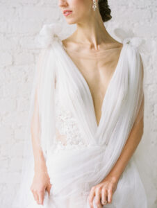A soft, neutral palette carried throughout the editorial, and it’s the kind of color story I’ll never get tired of—creamy whites, gentle ivories, barely-there blush tones, and whispery textures that feel romantic without being overly “sweet.” The goal wasn’t to create something loud. It was to create something refined. The kind of wedding inspiration that feels elevated, editorial, and timeless five years from now.