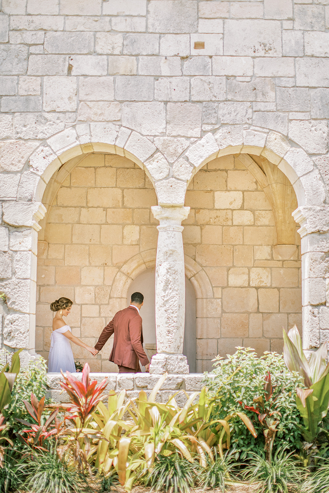 vizcaya a couple in a white dress and blue suit are standing under an archway in miami florida's vizcaya museum