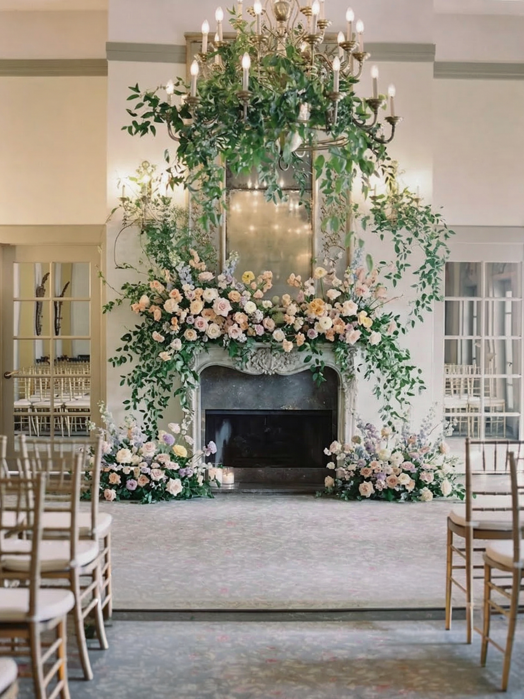 Greenery as ceremony decoration — branches and vines hung from a wooden arch or copper pipe structure, trailing natural foliage around a doorway or altar, large ferns placed at the base of ceremony columns — creates the quality of being married in a garden even within an entirely interior space. The combination of rich green foliage with white or blush florals and candlelight is one of those design combinations that never fails and never dates, and that photographs with a freshness and a richness that purely floral or purely fabric approaches do not achieve equally.