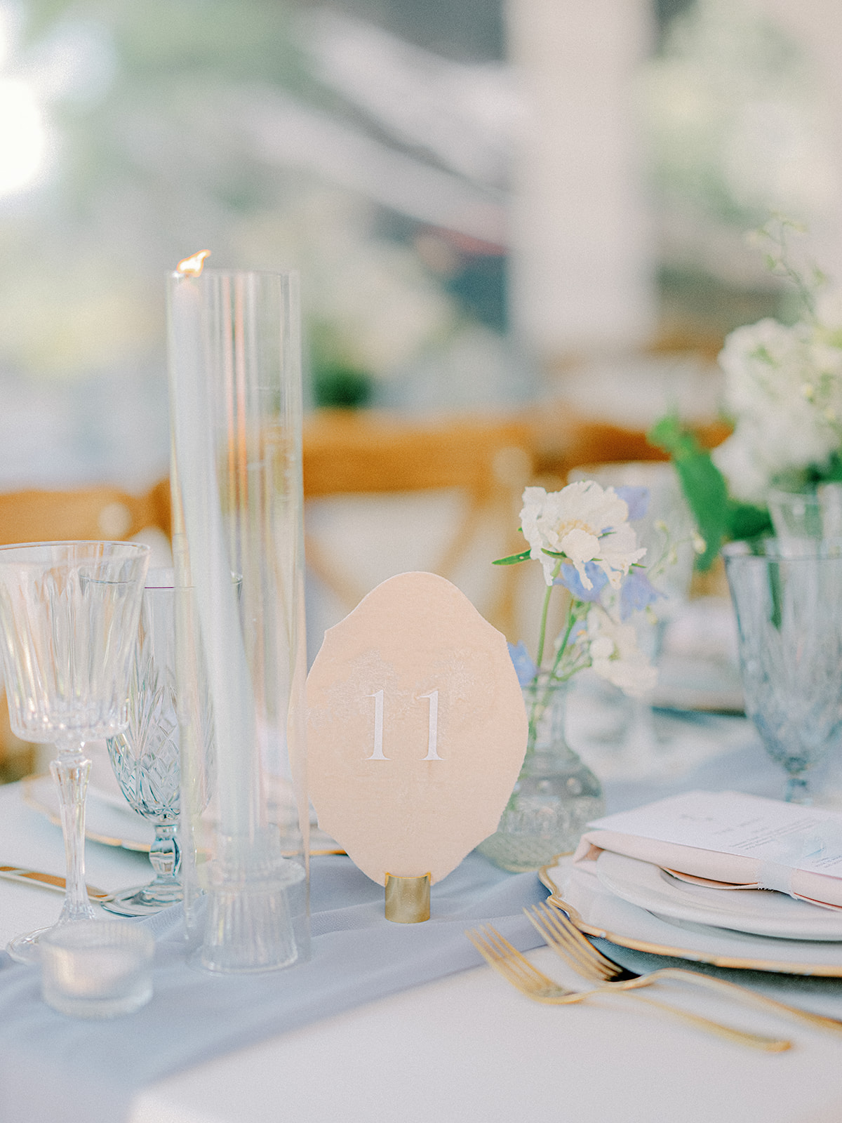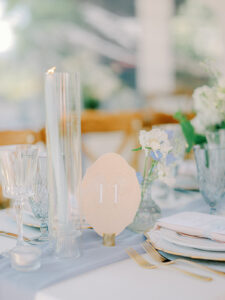 The coastal setting of Tupper Manor makes a palette of dusty blue and soft sage feel almost inevitable. These tones echo the ocean, the sky, and the surrounding New England landscape in a way that feels deeply connected to the place rather than imposed upon it. Paired with warm neutral tones in linens and florals, this palette creates a wedding aesthetic that feels simultaneously coastal, romantic, and refined.