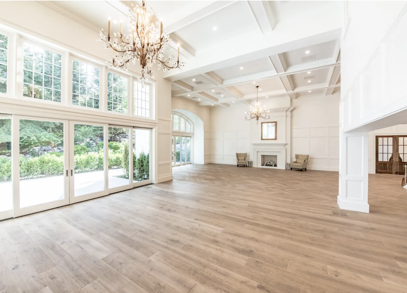 The floor-to-ceiling fireplace is the room’s defining focal point — a statement architectural feature that provides both visual drama and the quality of warmth and gathering that a great fireplace always brings to a space. In the evening, when the chandeliers and pendant lights come into their full effect and the fireplace is lit, the Grand Hall takes on a quality of candlelit intimacy that the bright daylight version of the room does not fully anticipate. The herringbone wood floors add texture and warmth beneath the feet and read beautifully in photographs — one of those material choices that separates venues designed with care from venues designed with competence.