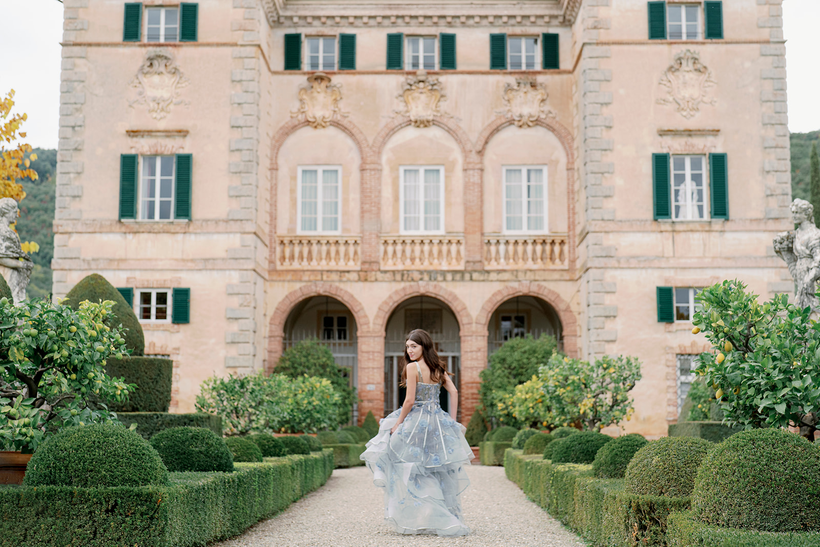 I have been inside this estate. I have photographed within these gardens and walked the Holy Wood and stood on the gravel drive as the afternoon light changes. I know how the front facade catches the last hour of sun and what the cypress lane looks like when it is lit by candles and how the light moves through the loggia in the morning. I know which corners of the estate reveal themselves gradually and which spaces photograph differently than you expect when you first see them.