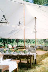 Ceremonies take place among the arborvitaes at the gazebo — a sheltered, intimate space with capacity for up to 200 guests that frames the exchange of vows within the living green architecture of the garden. The reception pavilion is crafted in an Old European-inspired style, open and airy with the capacity for comfortable dining and dancing, and equipped with a full prep kitchen and indoor restrooms that make the logistics of an outdoor event genuinely seamless.