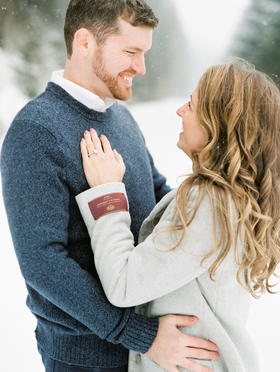 One of the biggest tips I give couples for a winter engagement session is to avoid white, cream, or very light neutrals. While those colors can be beautiful in other seasons, winter landscapes are often already light — snow, sky, and muted surroundings. Wearing darker, richer tones helps you stand out and creates depth in your photos.